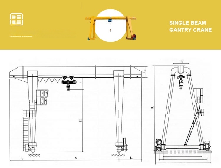❐The single girder gantry crane is a common industrial lifting equipment with a single-beam structure on the top and runs on the track. It is usually equipped with an electric wire rope hoist or an electric chain hoist as required as the lifting mechanism. The hoist is suspended under the main beam and moves with it. The main beam of the crane is supported by one or two legs and travels along the track through the end beam.